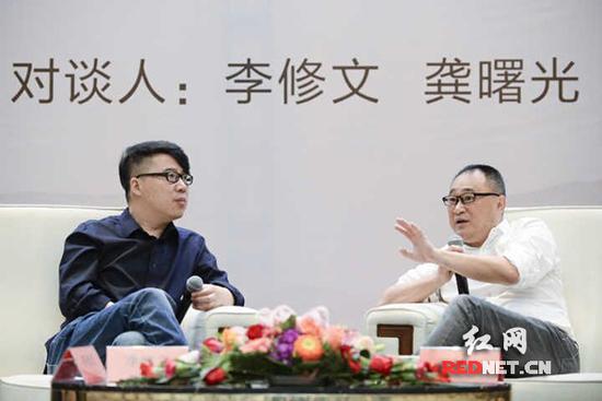 5月31日,河北廊坊,作家、影視劇編劇、監(jiān)制李修文(左)和湖南出版投資控股集團黨委書記、董事長,中南傳媒董事長龔曙光(右)進行題為“人民山河文辭袈裟”的文學對談。攝影/辜鵬博