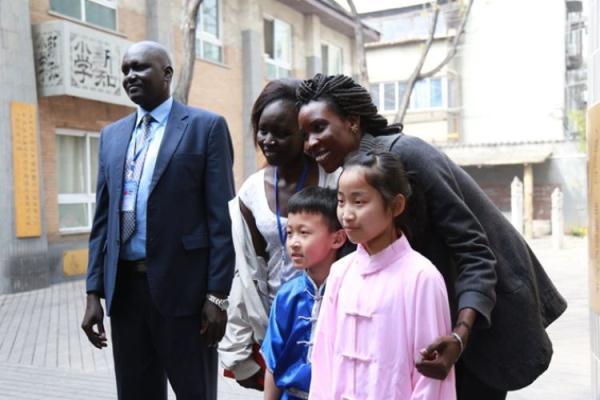 圖為三位南蘇丹教育工作者在參觀西安新知小學(xué)期間與在校學(xué)生合影(拍攝于2017年4月6日,中南傳媒提供)